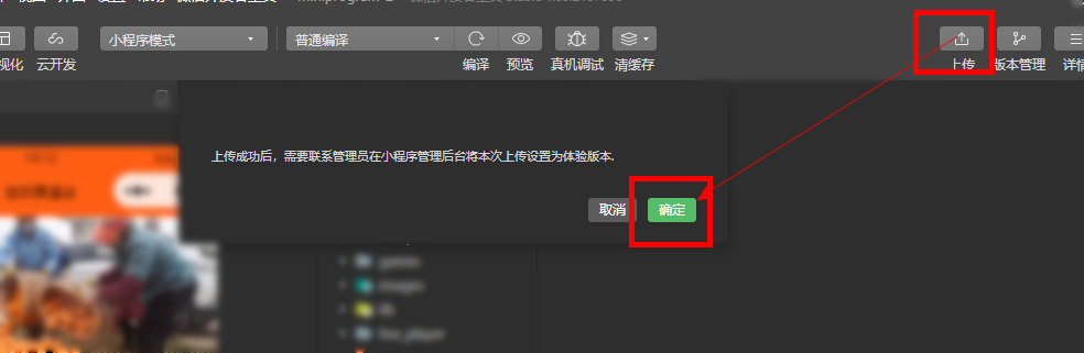 6、选择项目进入微信开发者工具后,在菜单栏中点击“工具”,并选择“上传”,输入版本号和项目备注后点击“上传”。