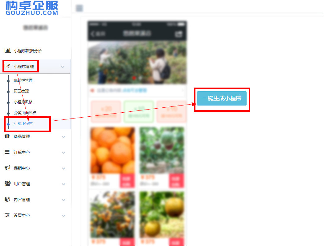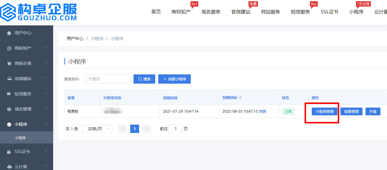 2、从网站【用户控制台-小程序】点击小程序管理,进入小程序管理后台,在小程序管理-生成小程序页面点击“一键生成小程序”进入打包小程序页面。