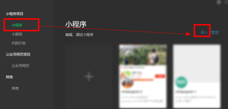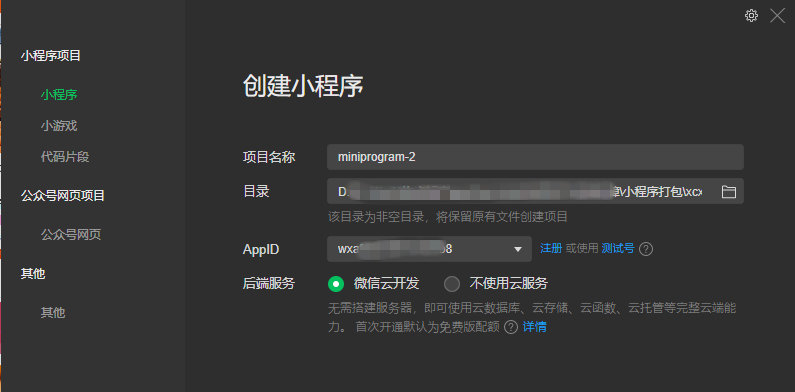 5、登录微信开发者工具,选择导入小程序,填写AppID、项目名称等信息,并选择解压后的打包的文件目录为项目目录。