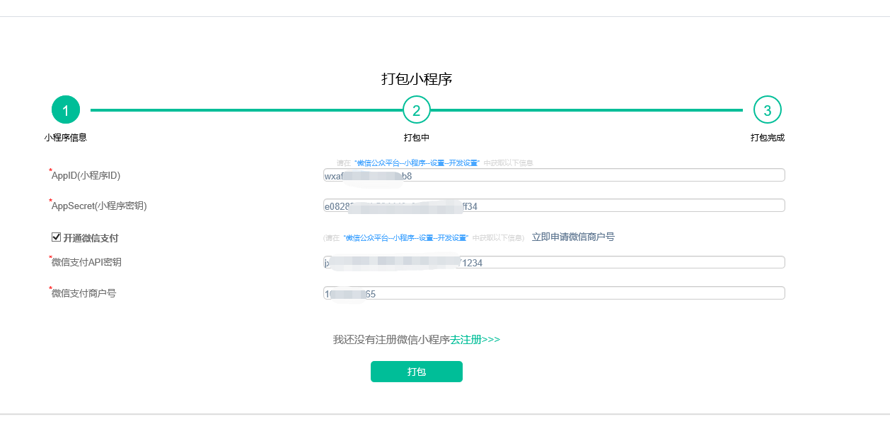 3、填写AppID,AppSecret后点击打包,打包成功后点击下载获取源码包,并解压源码包文件。