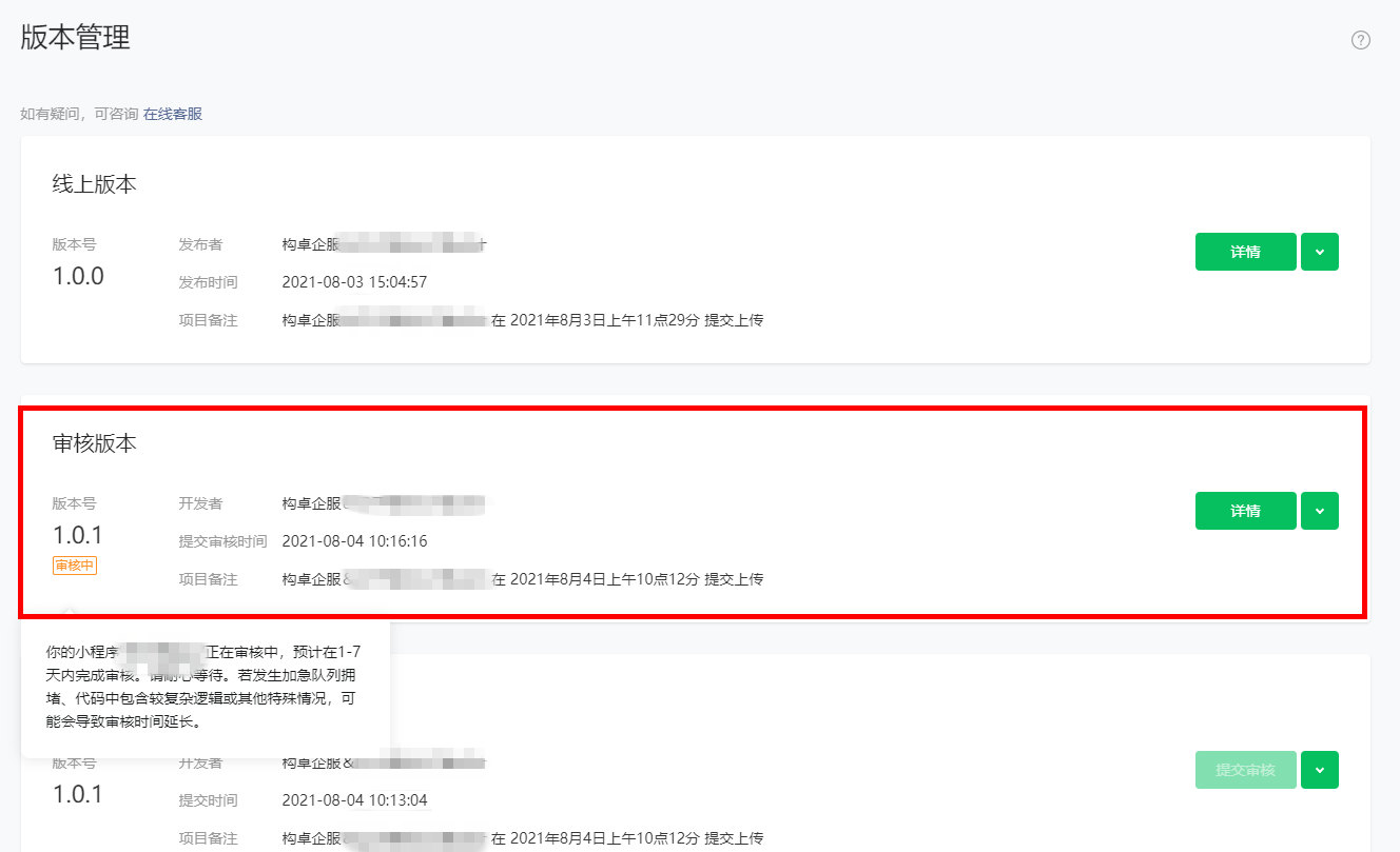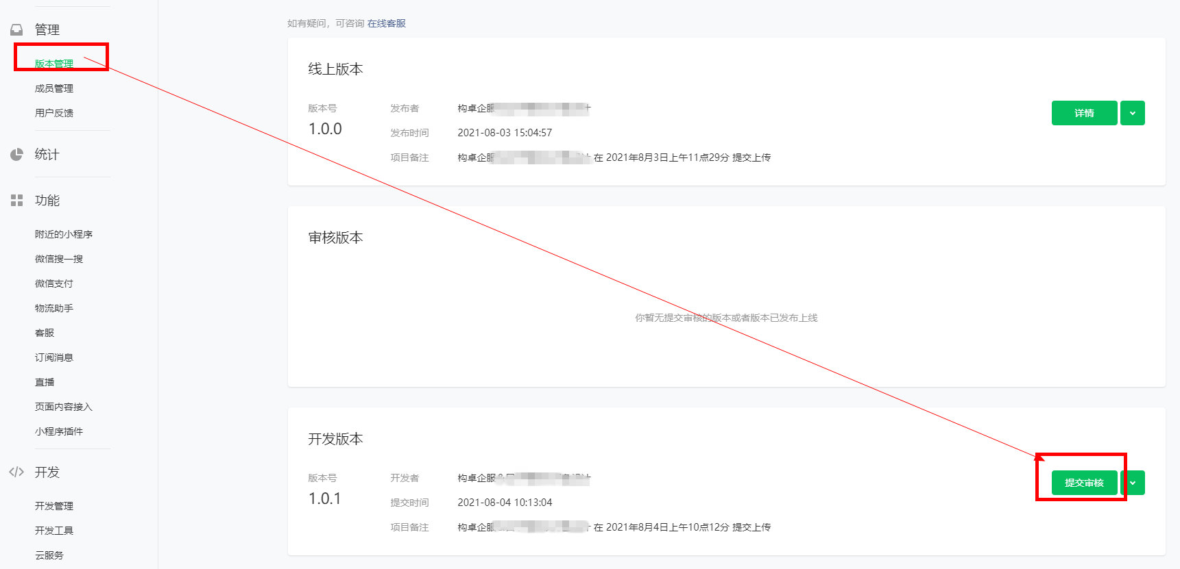 7、进入微信公众平台,登录后选择“版本管理”可见上一步上传的开发版本,点击“提交审核”,审核通过后发布即可使用小程序。