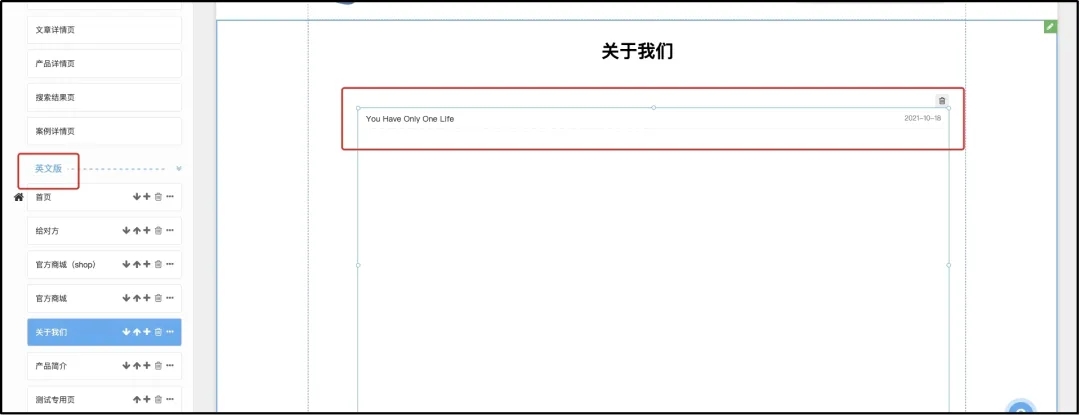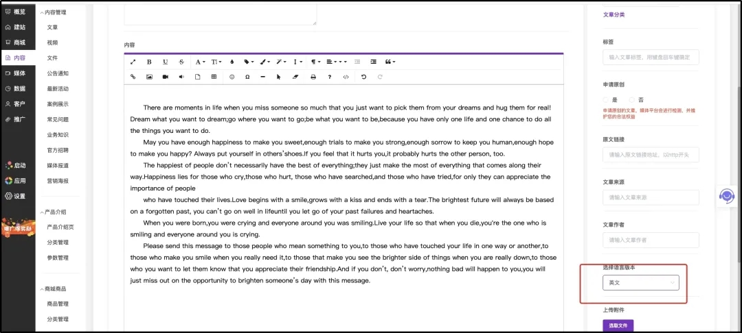 以文章为例,在新建或编辑文章的时候,语言版本中选择为中文,那么这篇文章只会在中文版的网站中显示,英文版网站是不会显示除英文版外其他文章的。