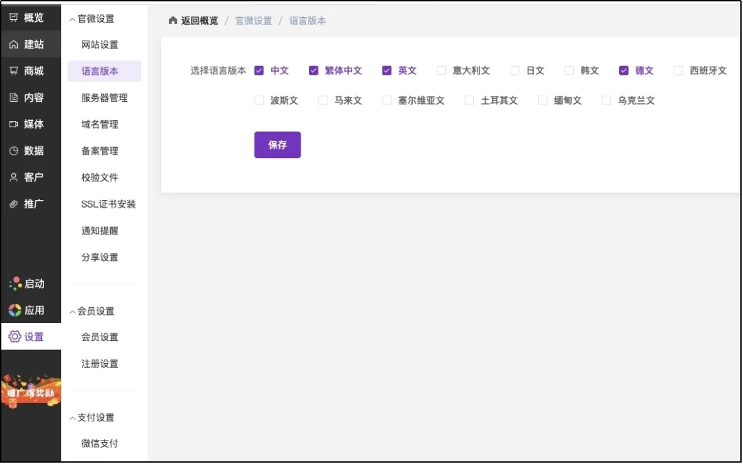 首先,在中文网站编辑完成之后,我们可以打开「设置」-「语言版本」,在其中选择要添加的语言种类,目前LTD官微中心支持22种语言版本设置!