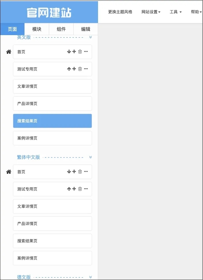 保存设置后,打开网站编辑器,就可以看到不同语言版本的网站了,此时所有的网站风格都是以原有已编辑好的中文网站为基础的,可以直接进行文本的替换和修改: