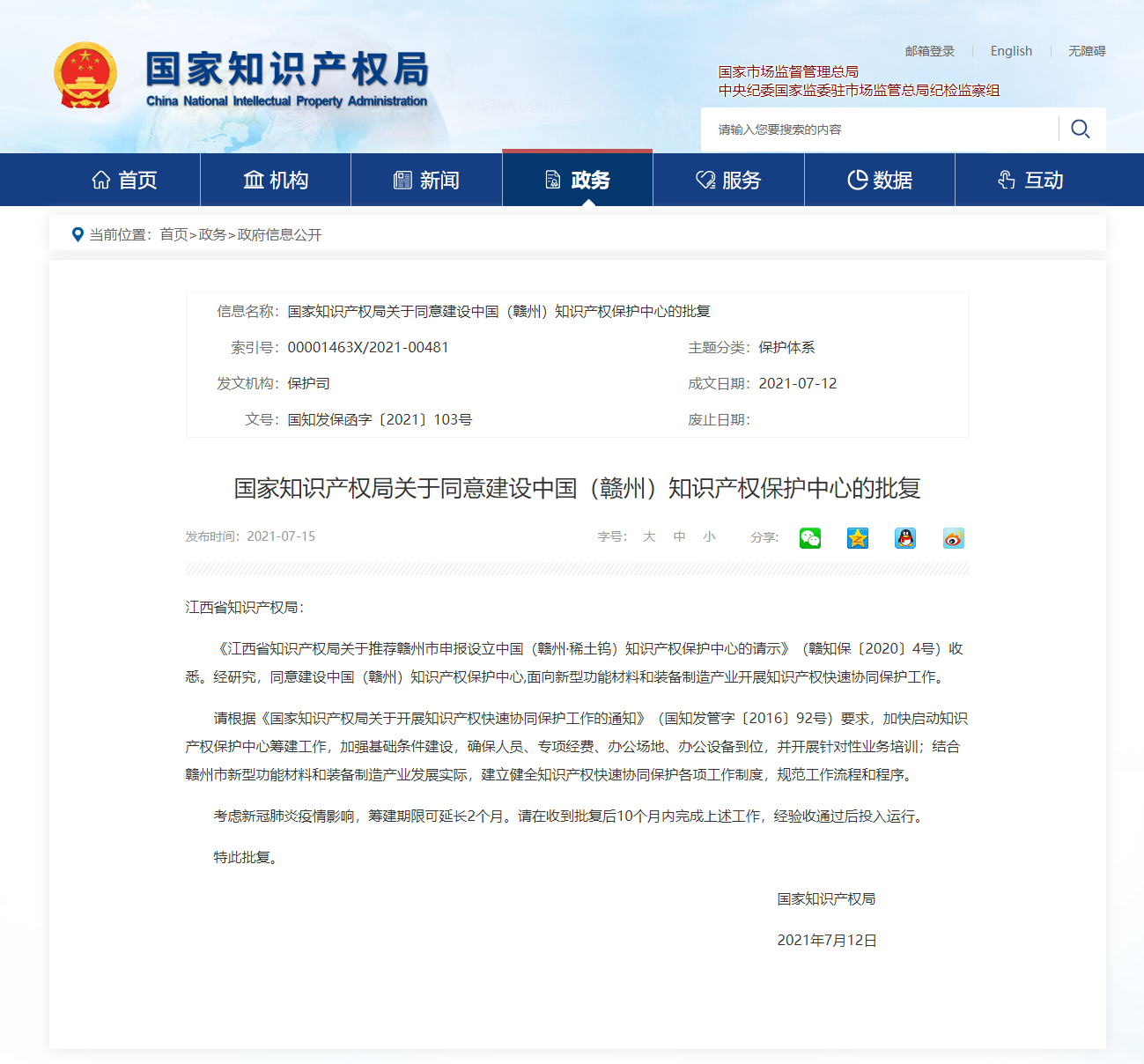 《江西省知识产权局关于推荐赣州市申报设立中国(赣州·稀土钨)知识产权保护中心的请示》(赣知保〔2020〕4号)收悉。经研究,同意建设中国(赣州)知识产权保护中心,面向新型功能材料和装备制造产业开展知识产权快速协同保护工作。
