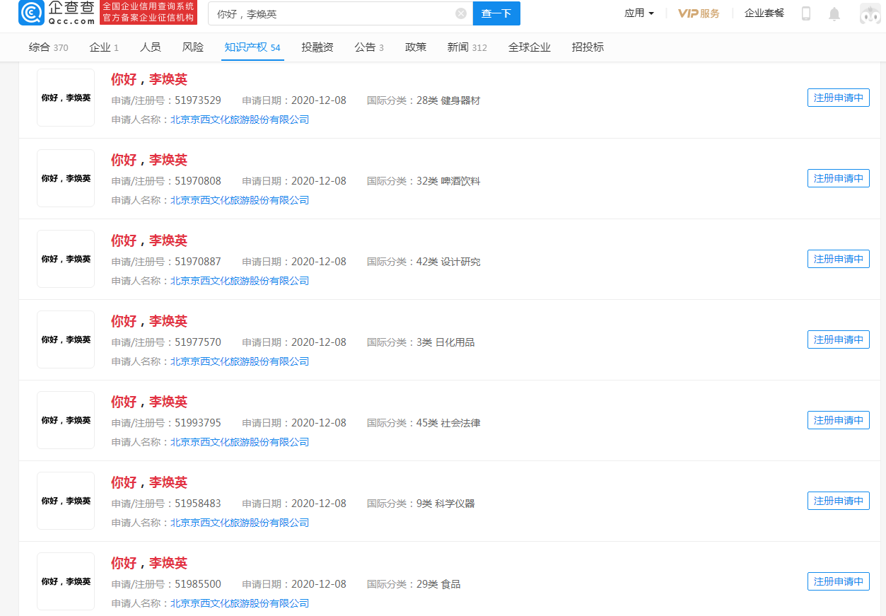 那么作为春节档最为火爆的电影之一,李焕英的商标如何呢?登录企查查网站查询发现,早在2020年12月8日,北京京西文化旅游股份有限公司就已经提交了“你好,李焕英”的商标注册申请,而且是全类别注册,目前查询结果显示注册申请中。