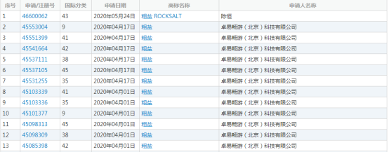在2020年4月到5月,卓易畅游为粗盐申请了相关商标,分别在第9类、35类、38类、41类、42类、43类、45类,有部分处于等待受理的阶段,部分正在等待实质审查。