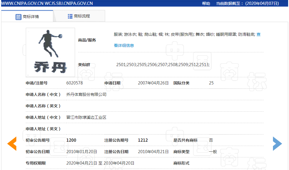 公司的发展少不了商标,为此乔丹体育名下配备了“乔丹”、“QIAODAN”、“乔丹体育”等一系列商标。这其中就有第6020578号“乔丹+图形”,这件商标申请注册于2007年04月26日,2010年04月21日注册成功,核准使用在25类服装; 游泳衣; 鞋; 爬山鞋; 帽; 袜; 皮带(服饰用); 舞衣; 婚纱; 睡眠用眼罩; 防滑鞋底等商品上。