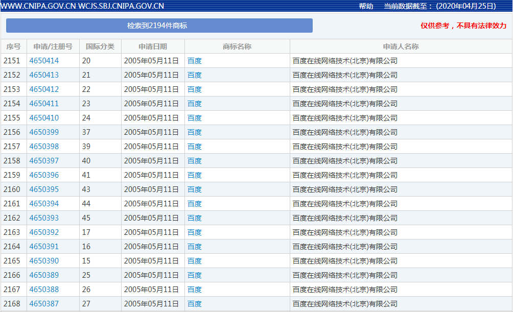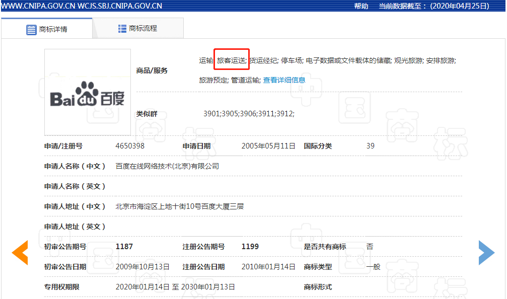 在百度的商标大家族中,早已有相关类别的商标。如第4650398号“百度”商标,注册类别包括“旅客运送”;第1579950号“百度”商标,注册类别包括“计算机系统分析”。