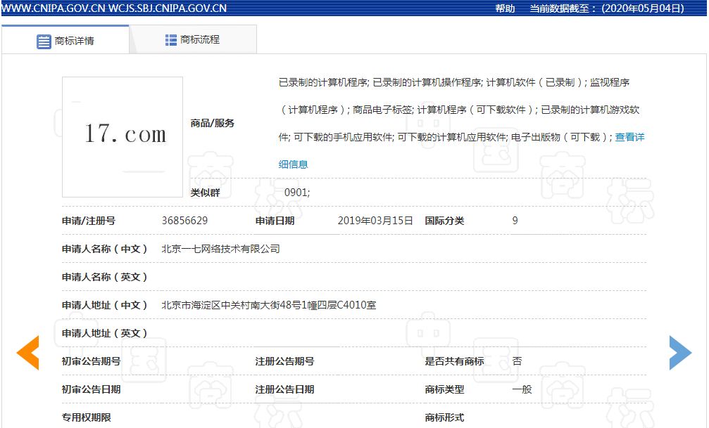 这件第9类的“17.COM”商标,申请注册于2019年3月15日,指定注册在已录制的计算机程序; 已录制的计算机操作程序; 计算机软件(已录制); 监视程序(计算机程序); 商品电子标签; 计算机程序(可下载软件); 已录制的计算机游戏软件; 可下载的手机应用软件; 可下载的计算机应用软件; 电子出版物(可下载)商品上。