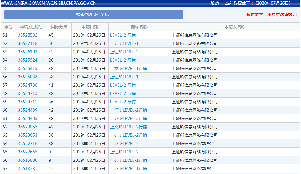 2019年2月25日和26日,上证所信息网络有限公司(下称上证所)集中申请注册了54件商标,包括“上交所LEVEL-1行情”、“上证所LEVEL-2行情”、“上证所LEVEL-1”、“上证所LEVEL-2”、“上证所LEVEL-1 行情”等等。