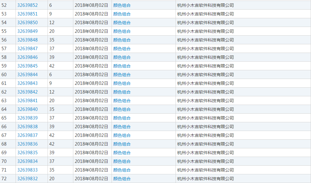 2018年8月2日,小木吉公司申请注册了34件颜色组合商标,这些颜色组合有三种样式,但结果无一例外,不是已经被驳回就是在驳回复审的路上,注册效果尤为惨淡。