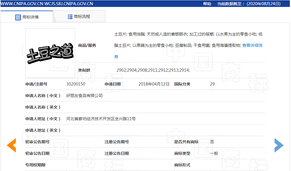 2018年04月12日,好丽友食品有限公司(下称好丽友),申请注册了第30200150号“土豆之道”商标,该商标申请注册在第29类土豆片; 食用油脂; 天然或人造的香肠肠衣; 加工过的槟榔; 以水果为主的零食小吃; 低脂土豆片; 以果蔬为主的零食小吃; 豆腐制品; 干食用菌; 食用海藻提取物等商品上。